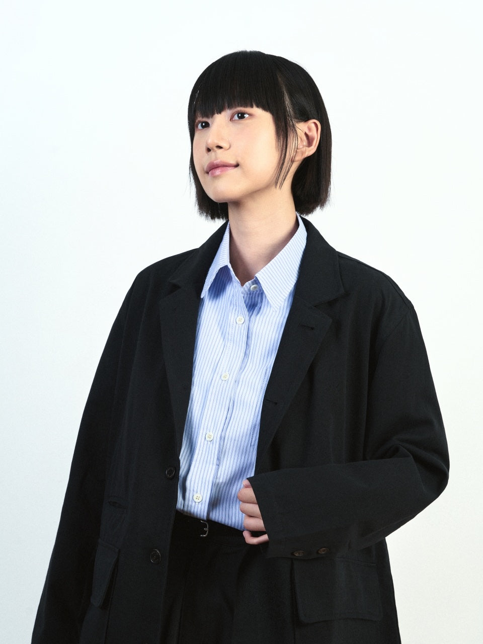 The natural shoulder line and semi-oversized design offer a comfortable yet polished look. The 3-button style allows various collar options for a flexible transition between formal and casual occasions.