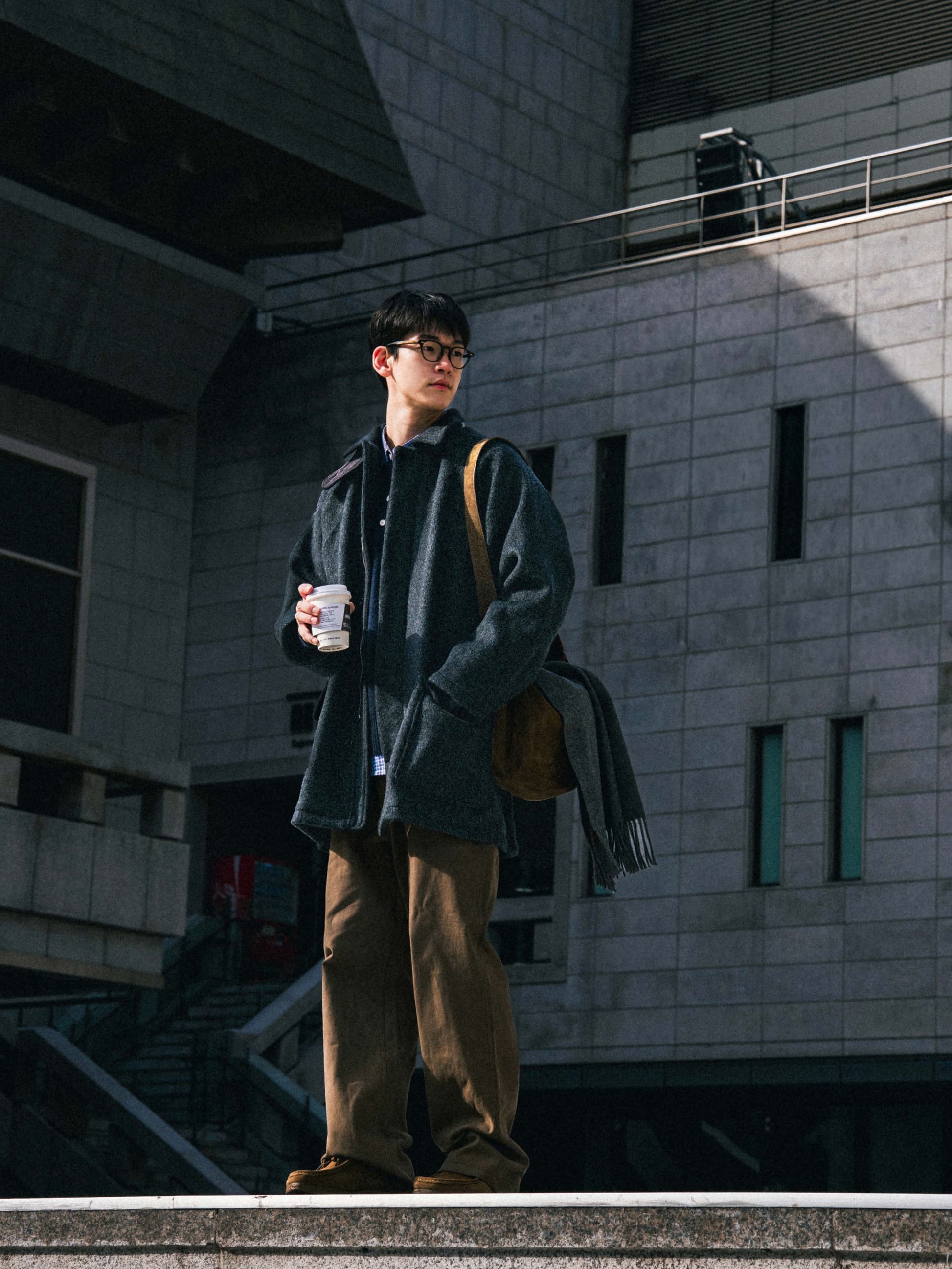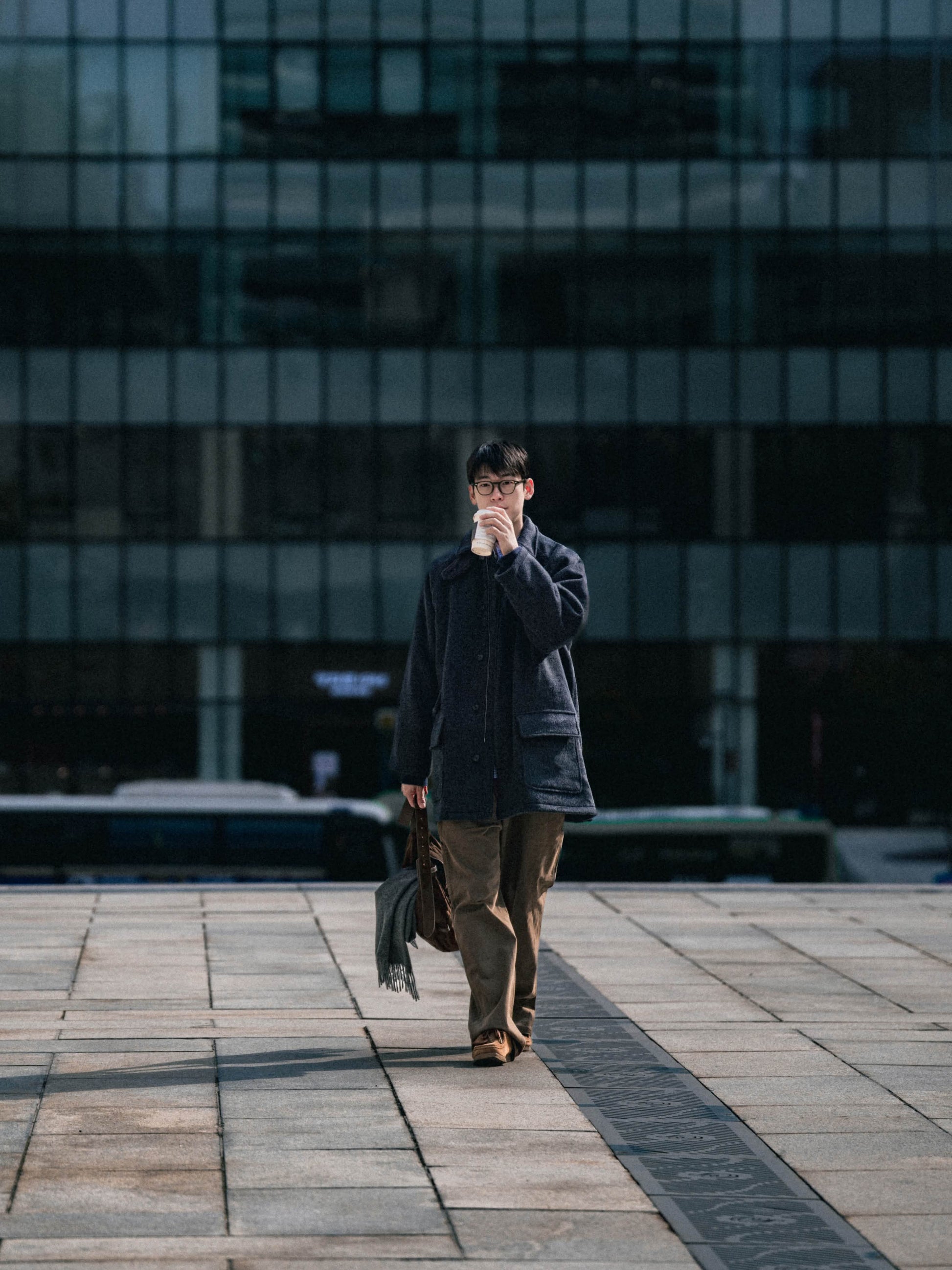 Thick tone-on-tone corduroy fabric is added to the cuffs, pocket flaps, and collar, injecting character into the wool's warmth. Rolled-up sleeves reveal the corduroy details, and the collar strap adds a special touch when the corduroy texture is raised to the neck.