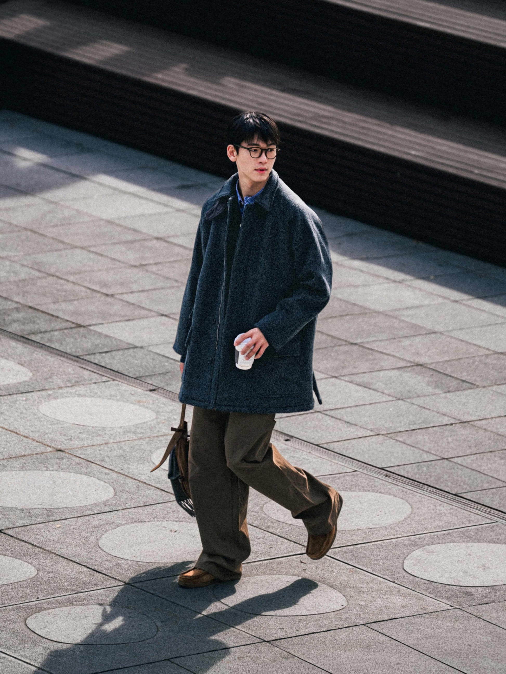 Thick tone-on-tone corduroy fabric is added to the cuffs, pocket flaps, and collar, injecting character into the wool's warmth. Rolled-up sleeves reveal the corduroy details, and the collar strap adds a special touch when the corduroy texture is raised to the neck.