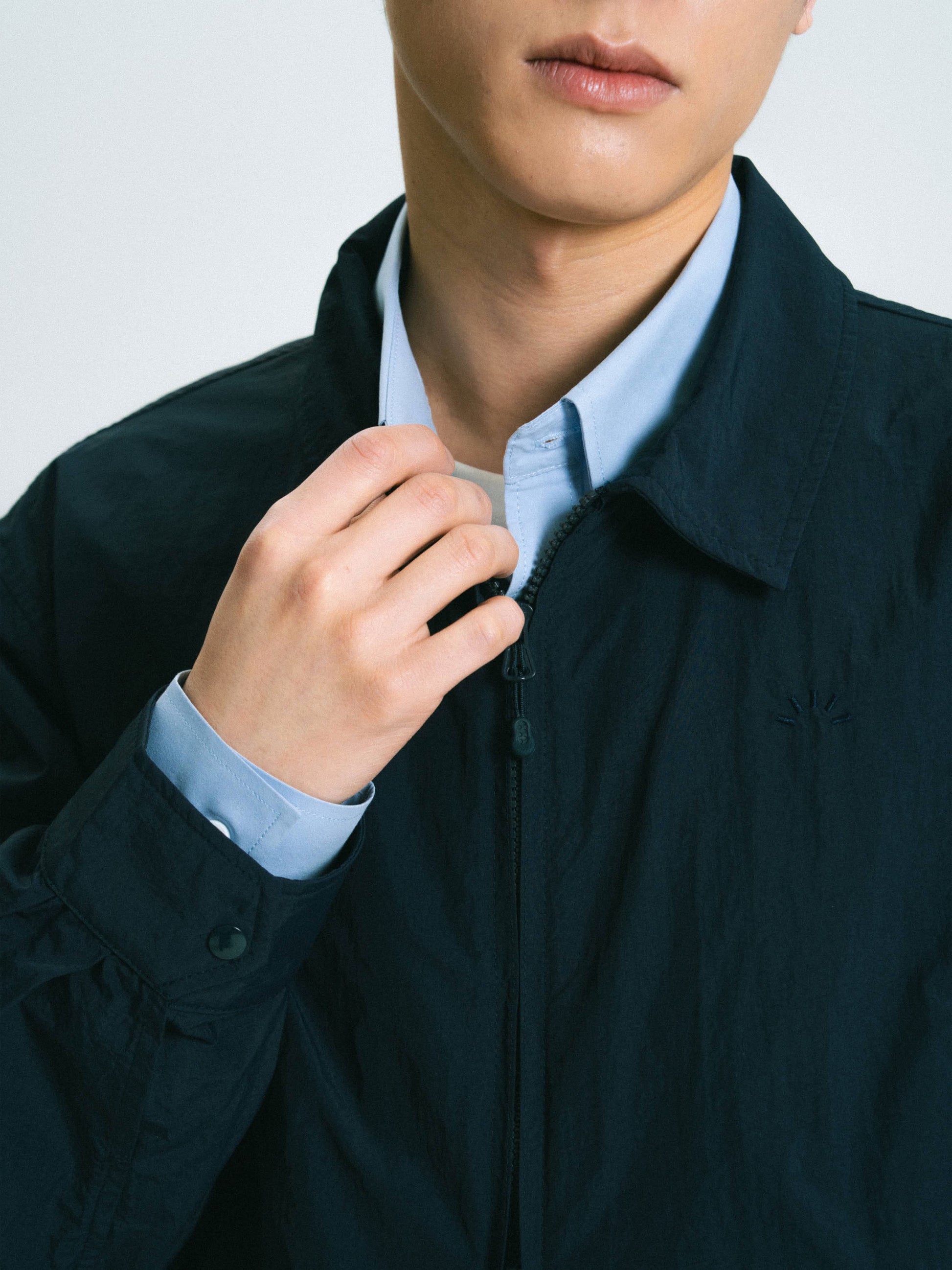 This piece reimagines the classic drizzler jacket with lightweight nylon and details like a two-way zipper. The tonal symbol logo embroidery is subtle but polished, and the two-way zipper lets you zip it up as much as you want for clean, easy layering. Zip pockets on the angled front pockets make it convenient to secure your essentials. With a cropped length and a comfortable fit, it layers well over a shirt or a lightweight knit. Available in three muted colors that work with a wide range of styles.