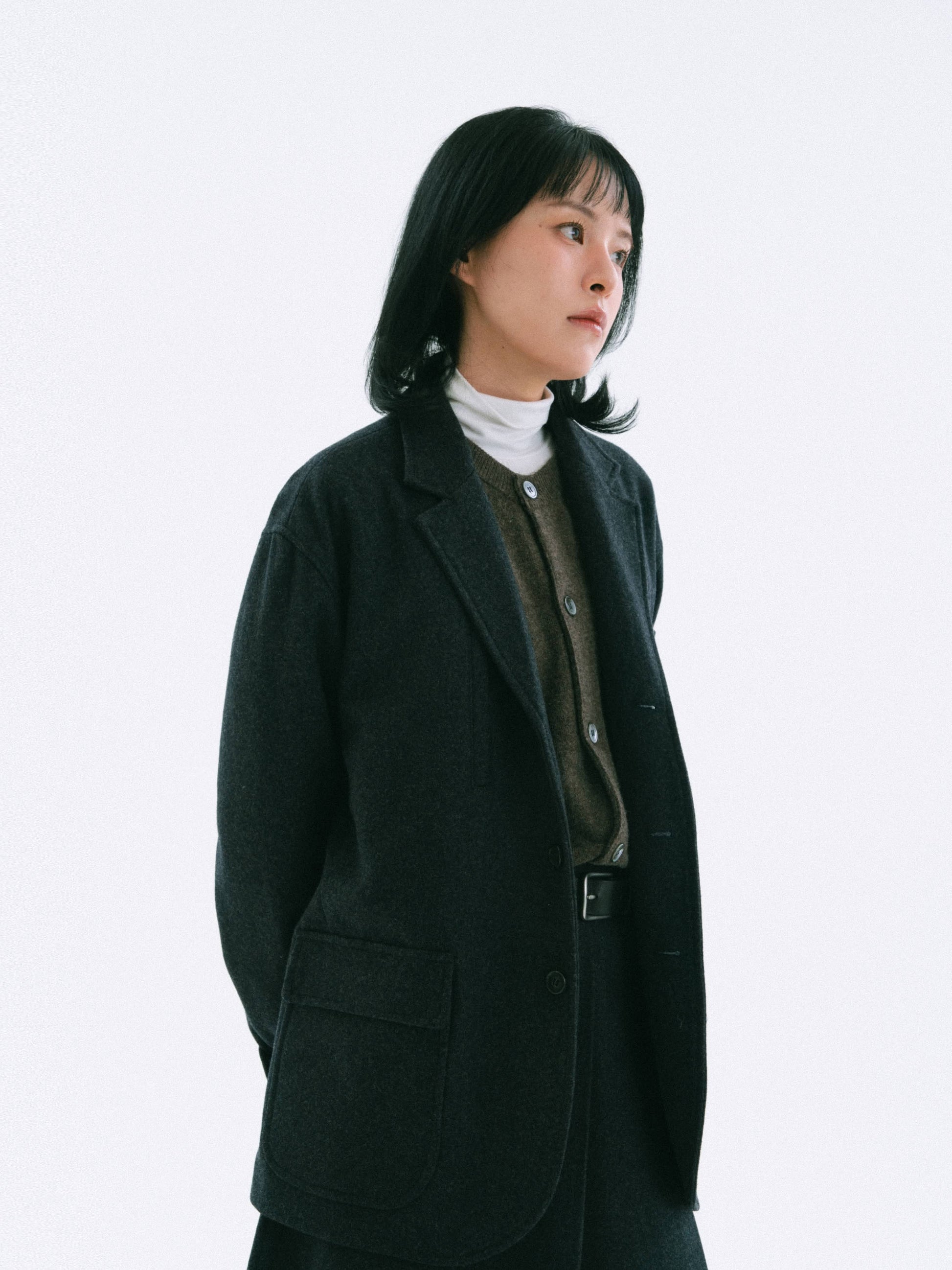 The balance of the lapel and buttons completes a clean look. The natural texture of wool-blend fabric connects formal occasions and everyday scenes seamlessly.