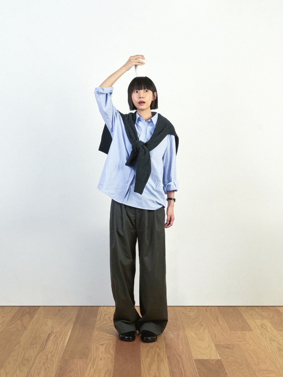 This shirt features a sky-blue double stripe pattern and a relaxed silhouette. It offers a comfortable fit for any body type with its natural shoulder line and cropped length, accented by square pocket detail. Made from high-density cotton fabric with post-processing washing, it's suitable for all seasons and resists deformation after washing. The fine double stitch and the subtle sunshine logo embroidery enhance its refinement.
