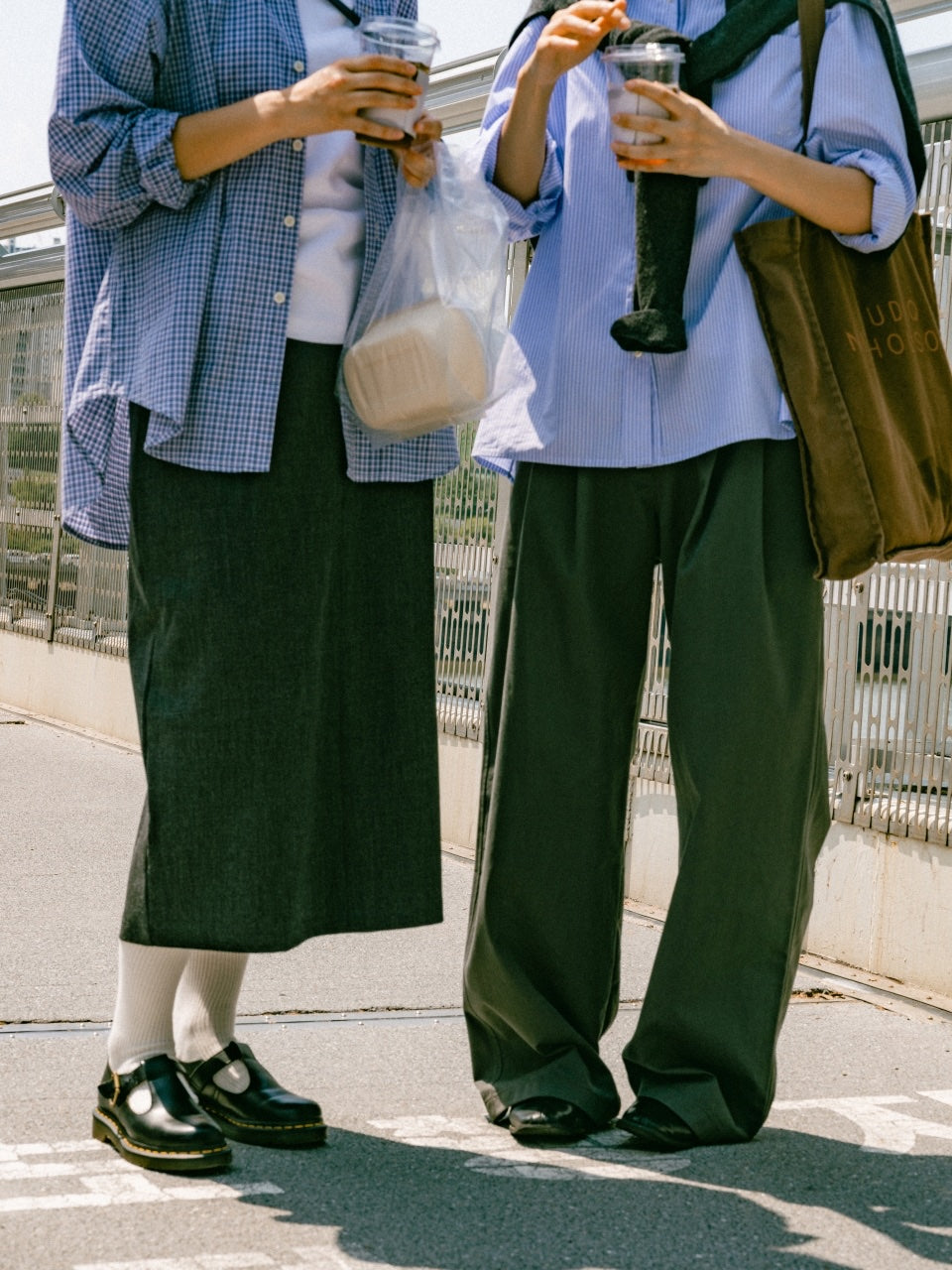 These pants have a semi-loose fit silhouette that falls neatly straight. The adjustable straps on both sides of the waist allow you to fine-tune the size to your shape, enabling you to wear them without the need for a separate belt.