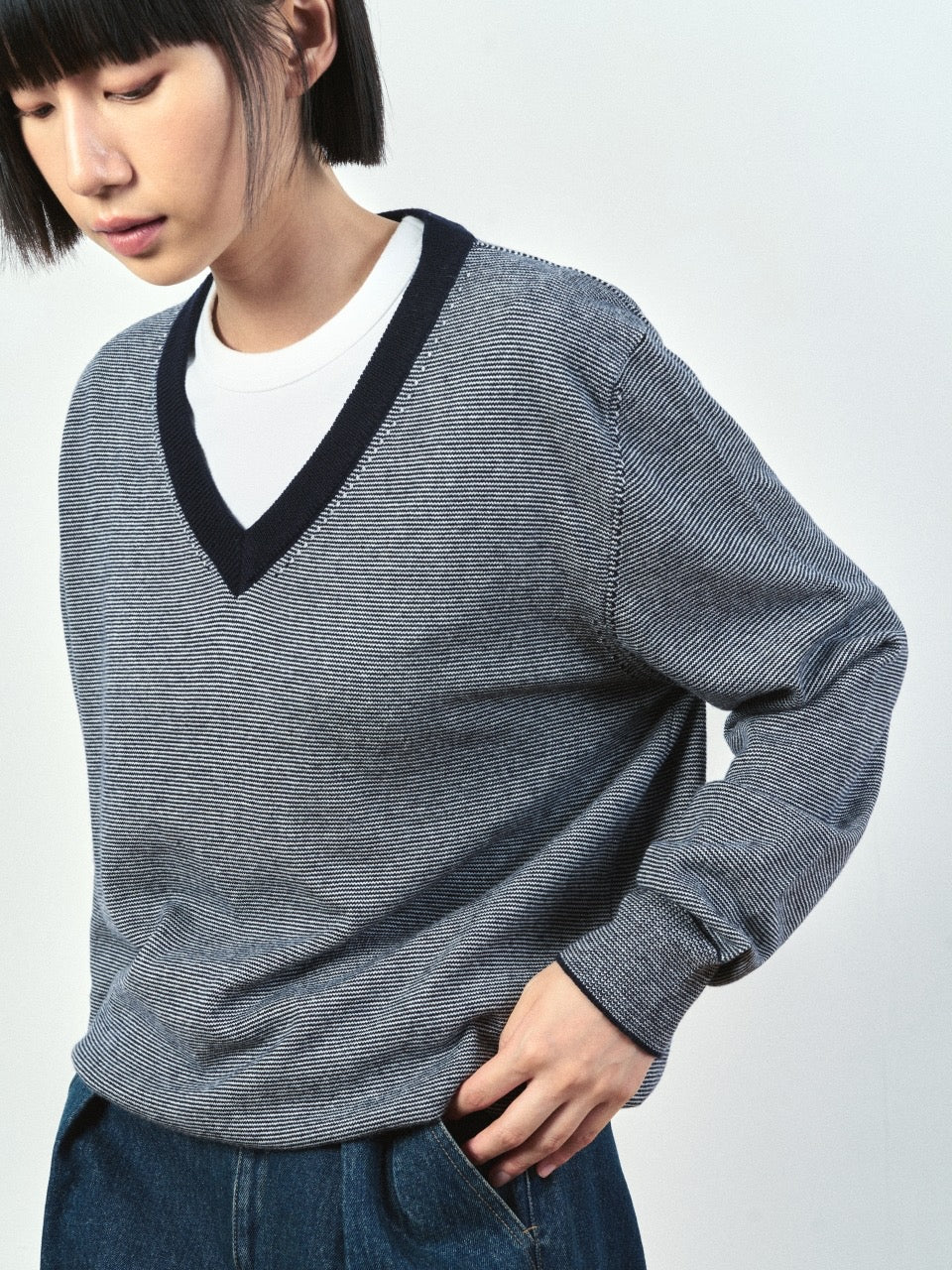 This knit combines a suitable depth V-neck and a relaxed silhouette with a subtle pinstripe pattern for a classic yet unique look.